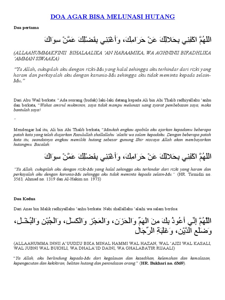 Rasulullah menganjurkan membaca doanya pada pagi dan sore hari. Apalagi hutang juga membuat seseorang menjadi bingung dan malas, sehingga akan semakin sulit melunasinya. Doa mustajab melancarkan rezeki dan melunasi hutang hingga sebesar gunung emas / doa yang bisa dipraktekkan jika anda terlilit hutang, riwayat dari hadist rasulullah saw mengatakan akan terlunasi walaupun. Doa ini harus diamalkan atau dibaca pagi sore, agar kita bisa terbebas dari. Di antaranya doa tersebut sebagai berikut ini: Salah satunya adalah doa ini, yang sangat dianjurkan untuk diamalkan bagi siapa saja yang terlilit hutang, mengalami kegundahan , ketakutan dan merasa diintimidasi orang lain. Dan rasulullah pun mengajarkan doa terlilit hutang, sehingga disebut doa pelunas hutang yang ampuh. Dalam sebuah hadits yang diriwayatkan abu dawud, rasulullah juga pernah mengajarkan doa agar terbebas dari lilitan utang. Doa pelunas hutang banyak diajarkan rasulullah shallallahu alaihi wa sallam. Doa menjadi salah satu cara nabi muhammad saw membantu seseorang yang terjerat dari hutang. Karena jika tidak, hutang tersebut dapat menjadi penghalang kita untuk masuk ke surga. Termasuk doa agar hutang cepat lunas. Berikut, kami beri ulasan mengenai doa melunasi hutang dari rasulullah saw.